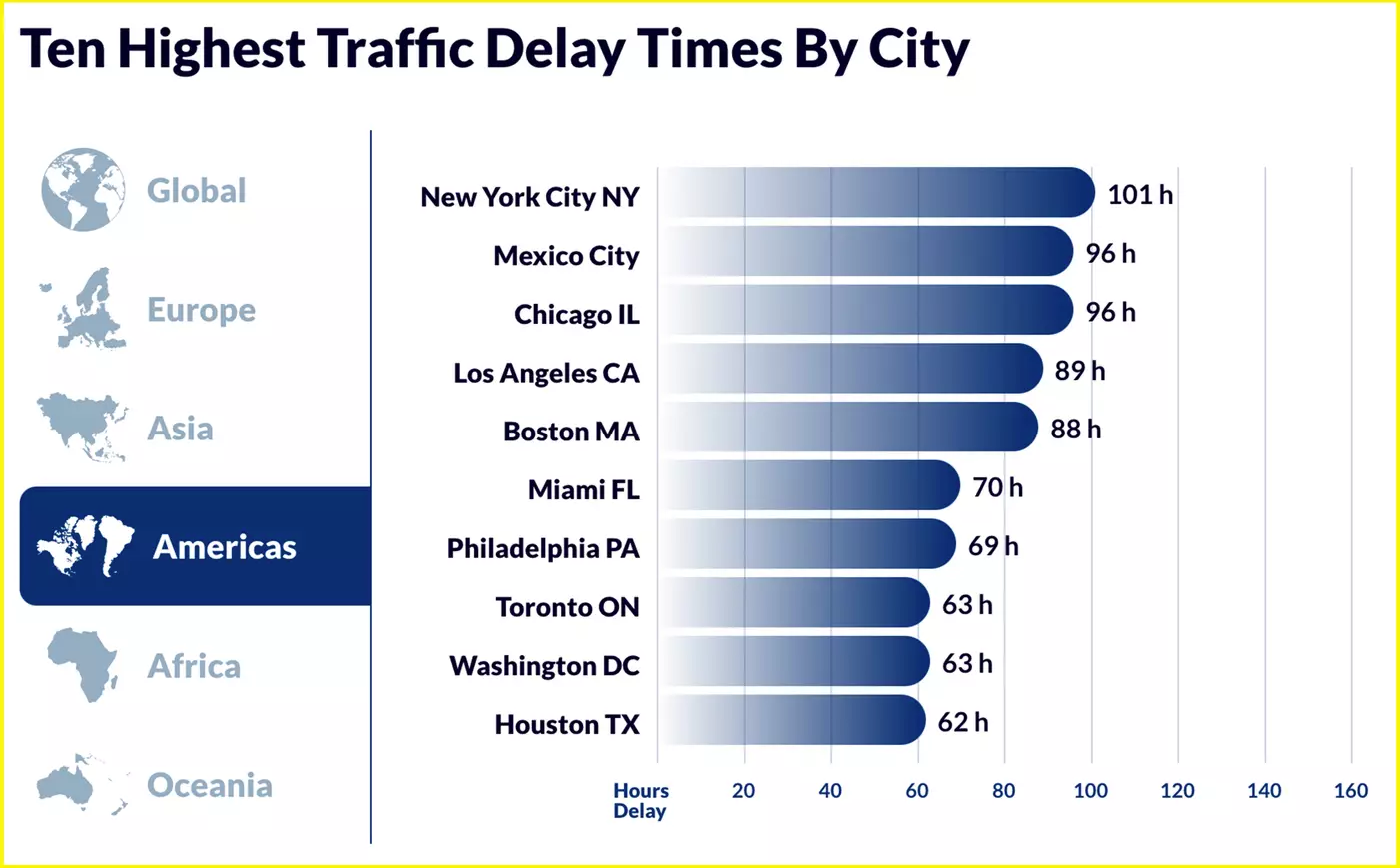 بر اساس این گزارش، در بین پُرترافیکترین شهرهای قاره آمریکا، تورنتو رتبه هشتم را کسب کرده و بدترین شهر کانادا از نظر ترافیک است. تورنتو همچنین در رتبه هفدهم پُرترافیکترین شهرهای جهان قرار دارد.