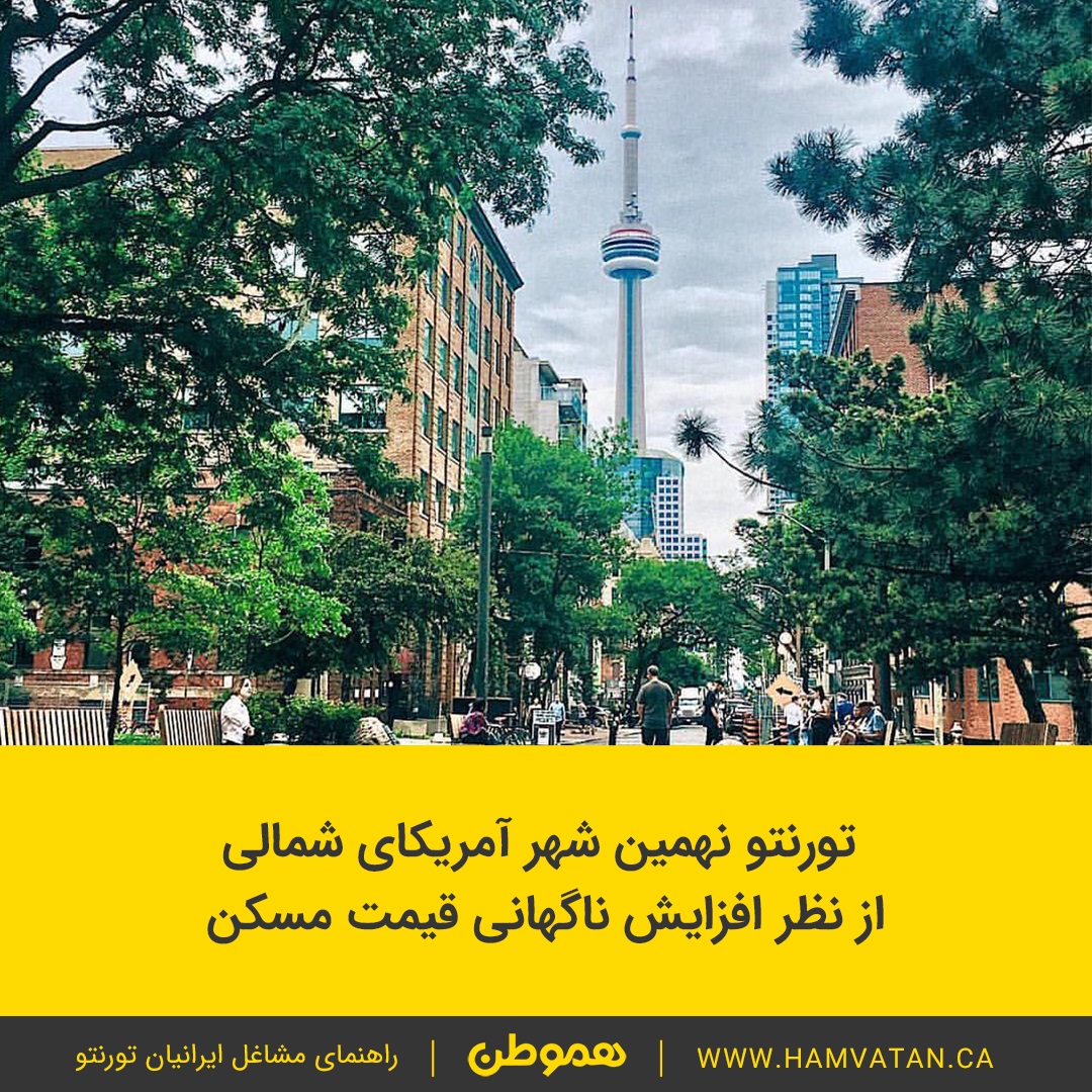 گزارش اخیر نشان می دهد که قیمت مسکن در تورنتو نسبت به 5 سال پیش 59 درصد افزایش داشته است. در میان شهرهای آمریکای شمالی، تورنتو نهمین شهر از نظر افزایش قیمت بوده است.