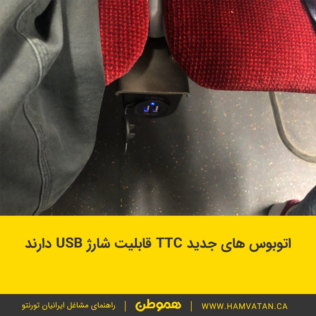 زیر صندلی های اتوبوس های جدید TTC دو عدد پورت یو اس بی برای استفاده مسافران تعبیه شده است.