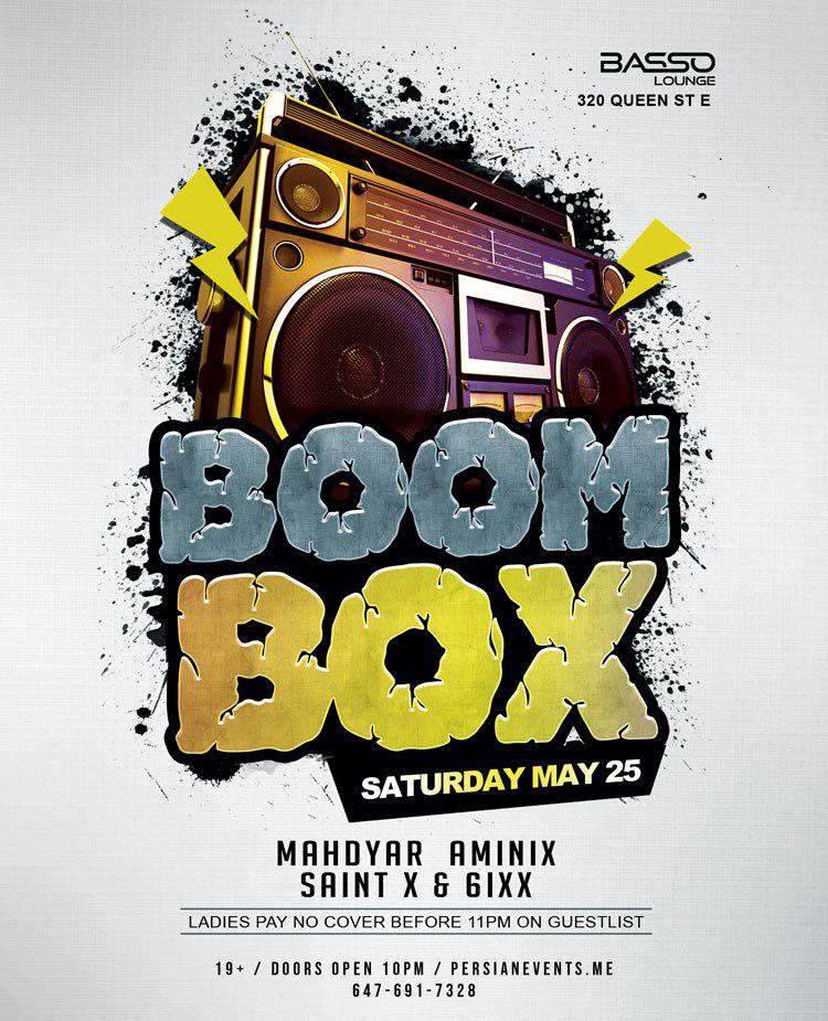 پارتى Boom Box در Basso Lounge تورنتو. شنبه 25 مى. با حضور دی جی Mahdyar، دی جی Aminix و Saint X