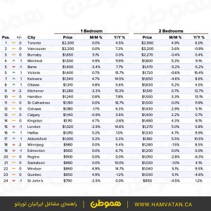 در ونکوور اجاره بهای واحد یک خوابه نسبت به ماه قبل اندکی کاهش یافته و ماهانه ۲٫۱۷۰ دلار است. اجاره بهای واحد دو خوابه نیز با اندکی افزایش به ۳٫۲۳۰ دلار رسیده. فهرست کامل شهرها: