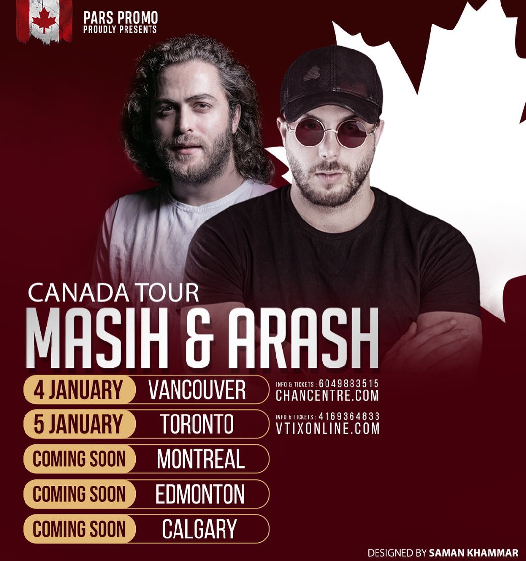 مسیح و آرش در تاریخ ۵ ژانویه ۲۰۲۰ در تورنتو کنسرت خواهند داشت. این کنسرت در سالن John Bassett Theatre خواهد بود. قیمت بلیط ها از ۴۵ تا ۱۵۰ دلار است. دوستان خود را از این رویداد باخبر کنید!