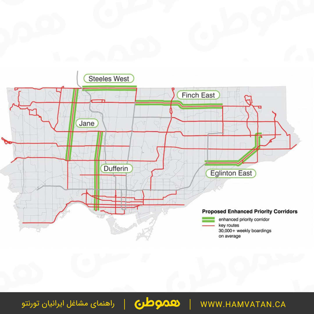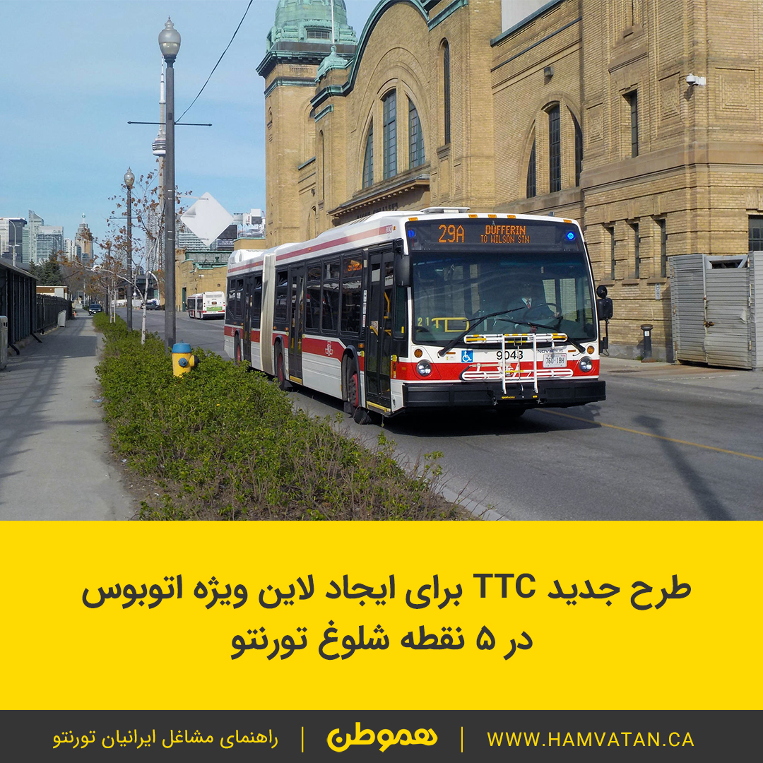 طرح جدیدی توسط TTC ارائه شده که در صورت تایید نهایی، در ۵ نقطه شلوغ و پرتردد تورنتو لاین ویژه اتوبوس ایجاد خواهد شد. این کار سرعت و کیفیت خدمت رسانی را افزایش خواهد داد.
