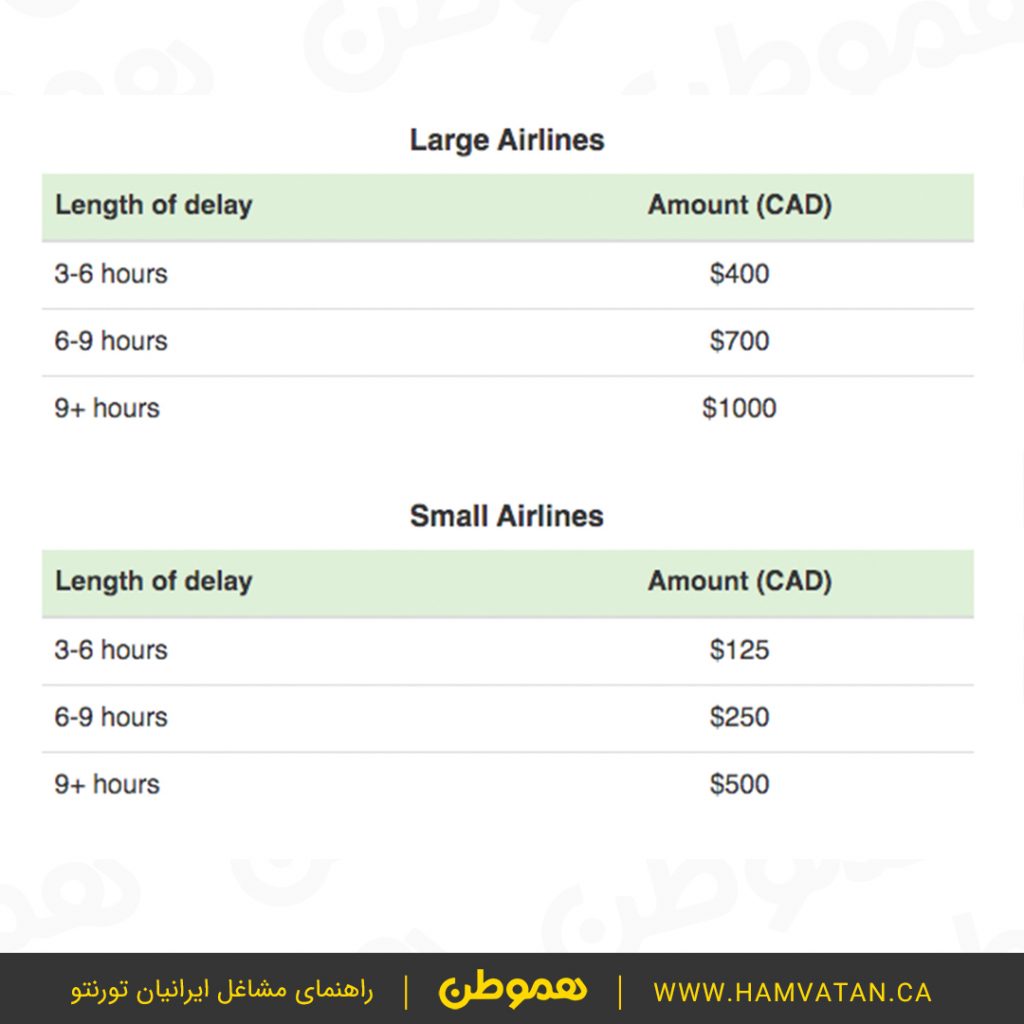 از این پس در کانادا اگر پرواز شما تاخیر داشته باشد، ایرلاین مربوطه موظف است تا هزار دلار غرامت تاخیر یا لغو پرواز پرداخت کند. از تاریخ ۱۵ دسامبر ۲۰۱۹ فاز دوم قوانین جدید آژانس حمل و نقل کانادا (CTA) آغاز می شود. طبق قوانین جدید، این موارد باید توسط ایرلاین ها رعایت شود:
