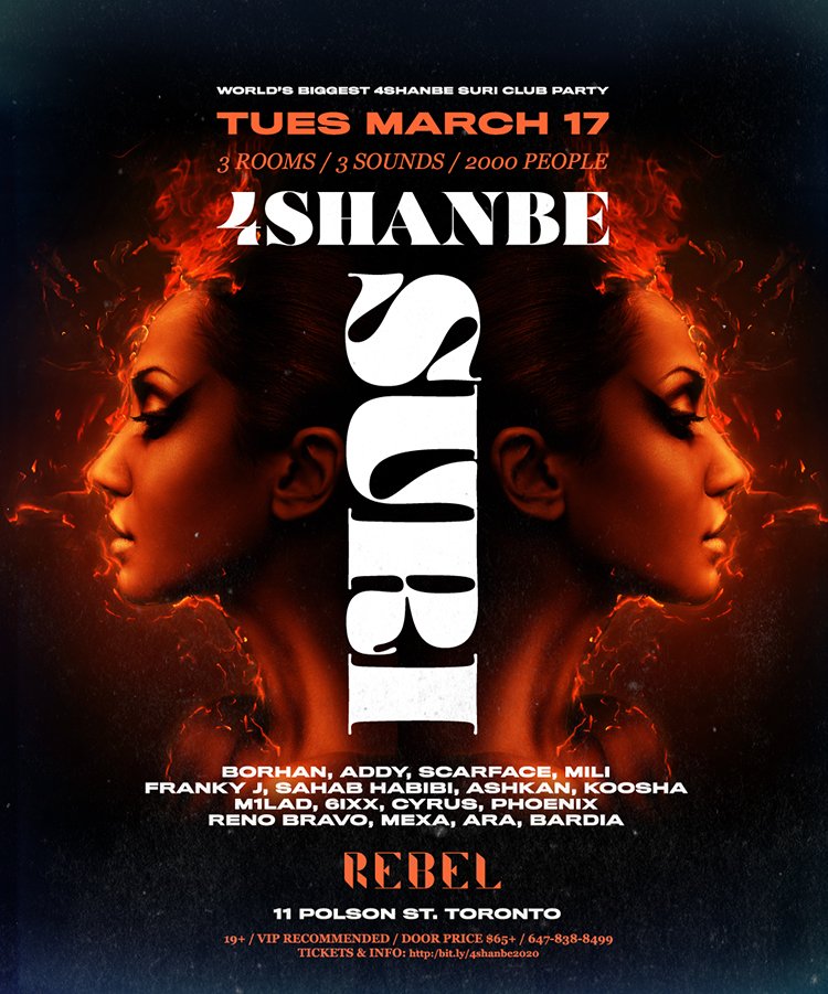 چهارشنبه سوری را در نایت کلاب ربل تورنتو منفجر کنید! قیمت بلیط در حال حاضر ۴۰ دلار است. پکیج های VIP از ۷۵۰ دلار آغاز می شود. برای مشاهده اطلاعات بیشتر به لینک خرید بلیط مراجعه کنید.