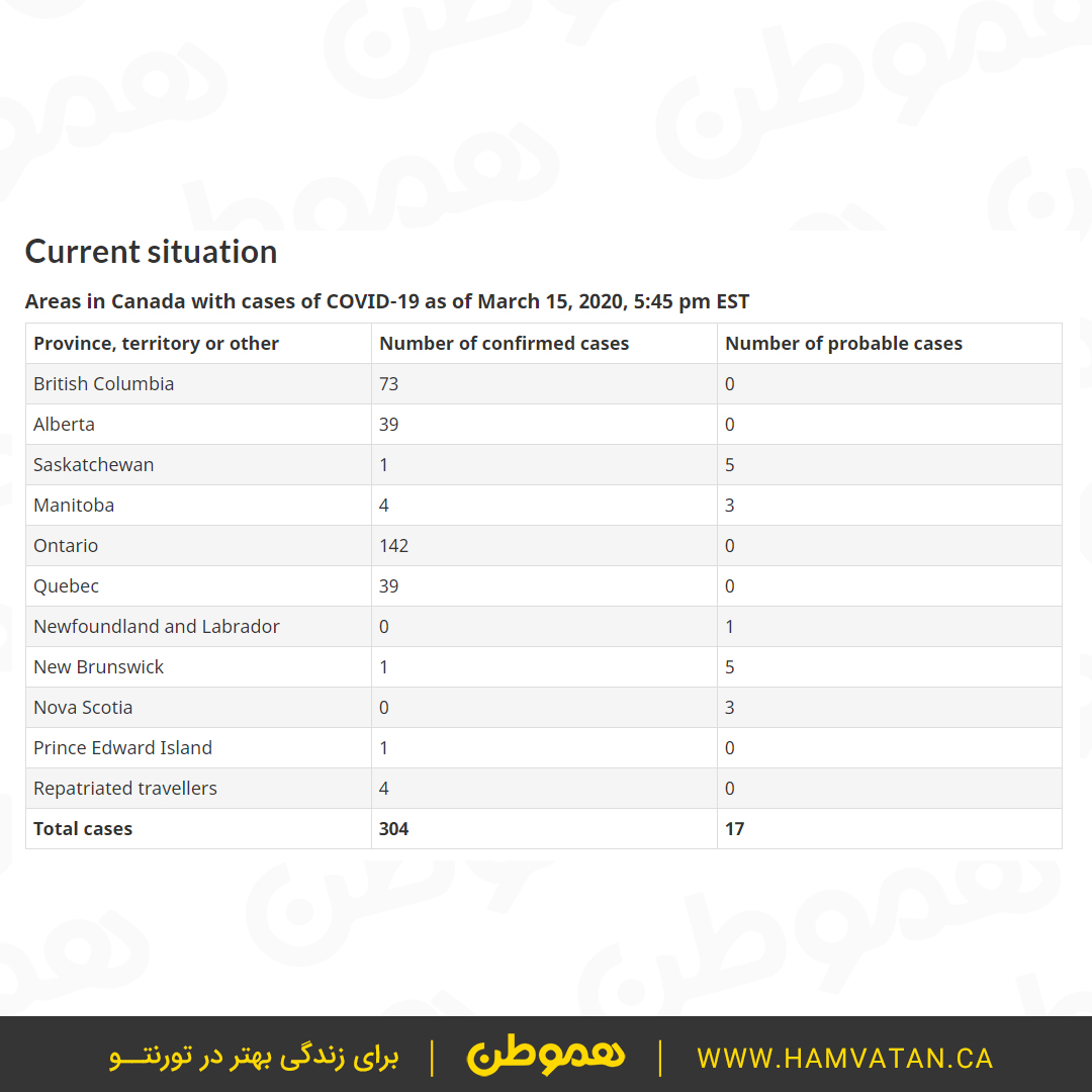 طبق آخرین گزارش آژانس بهداشت کانادا، تا ساعت ۵:۴۵ یکشنبه ۱۵ مارس، تعداد ۳۰۴ مورد ابتلا به کرونا در کانادا تایید شده که تعداد ۱۴۲ مورد در آنتاریو بوده است. از میان ۳۰۴ نفر مبتلا به کرونا در کانادا: