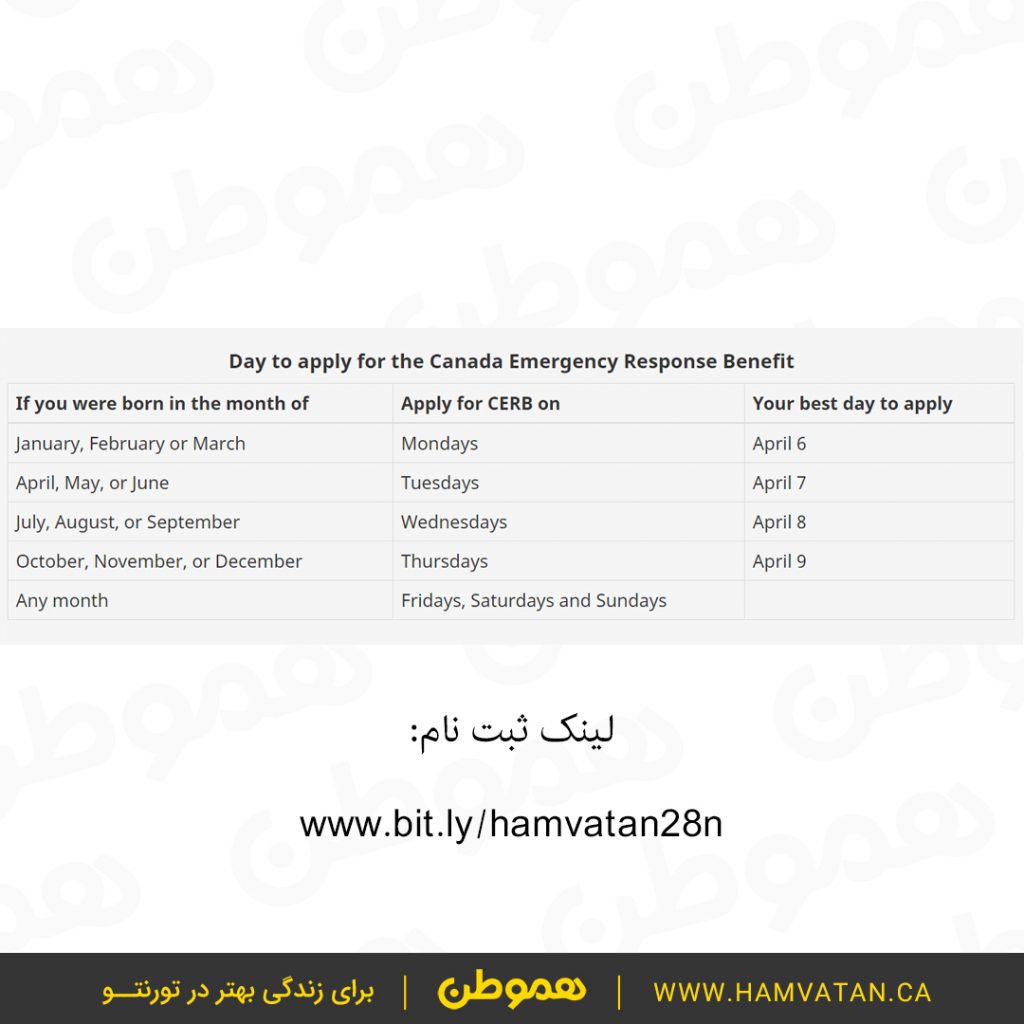 قبل از تاریخ ۶ آپریل، افرادی که بیکار هستند و واجد شرایط بیمه بیکاری هستند، می توانند همچنان در سایت بیمه بیکاری ثبت نام کنند. طبق گفته جاستین ترودو، این افراد در صورت ثبت نام برای بیمه بیکاری، لازم نیست در این طرح ثبت نام کنند. جدول زمان بندی به شرح زیر است: برای ثبت نام کلیک کنید.