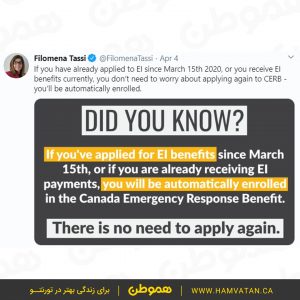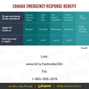 سامانه ثبت نام برای دریافت کمک هزینه اضطراری کانادا (CERB) از امروز دوشنبه ۶ آپریل فعال شده است. افراد واجد شرایط می توانند با توجه به ماه تولد و زمان بندی اعلام شده در این سامانه ثبت نام کنند.