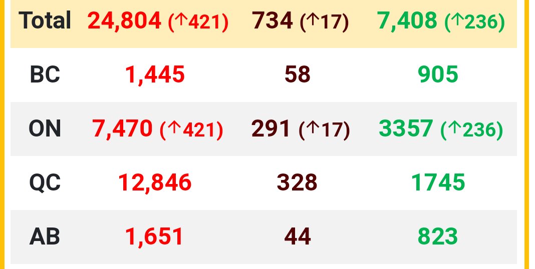 تعداد کل مبتلایان در کانادا ۲۴۸۰۴ نفر بوده که ۷۴۰۸ نفر بهبود یافته اند.