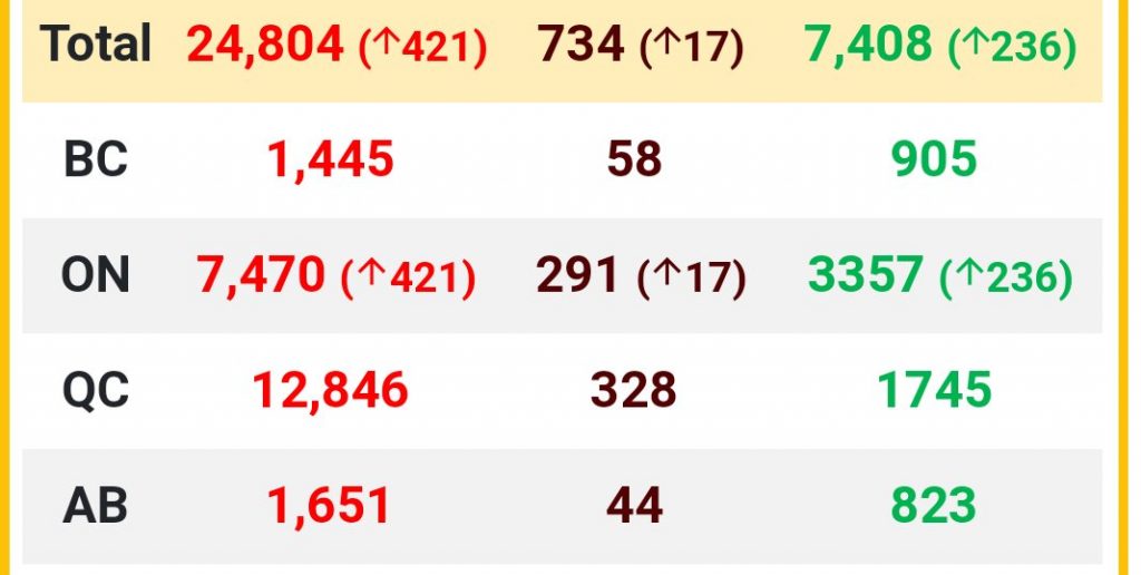 تعداد کل مبتلایان در کانادا ۲۴۸۰۴ نفر بوده که ۷۴۰۸ نفر بهبود یافته اند.