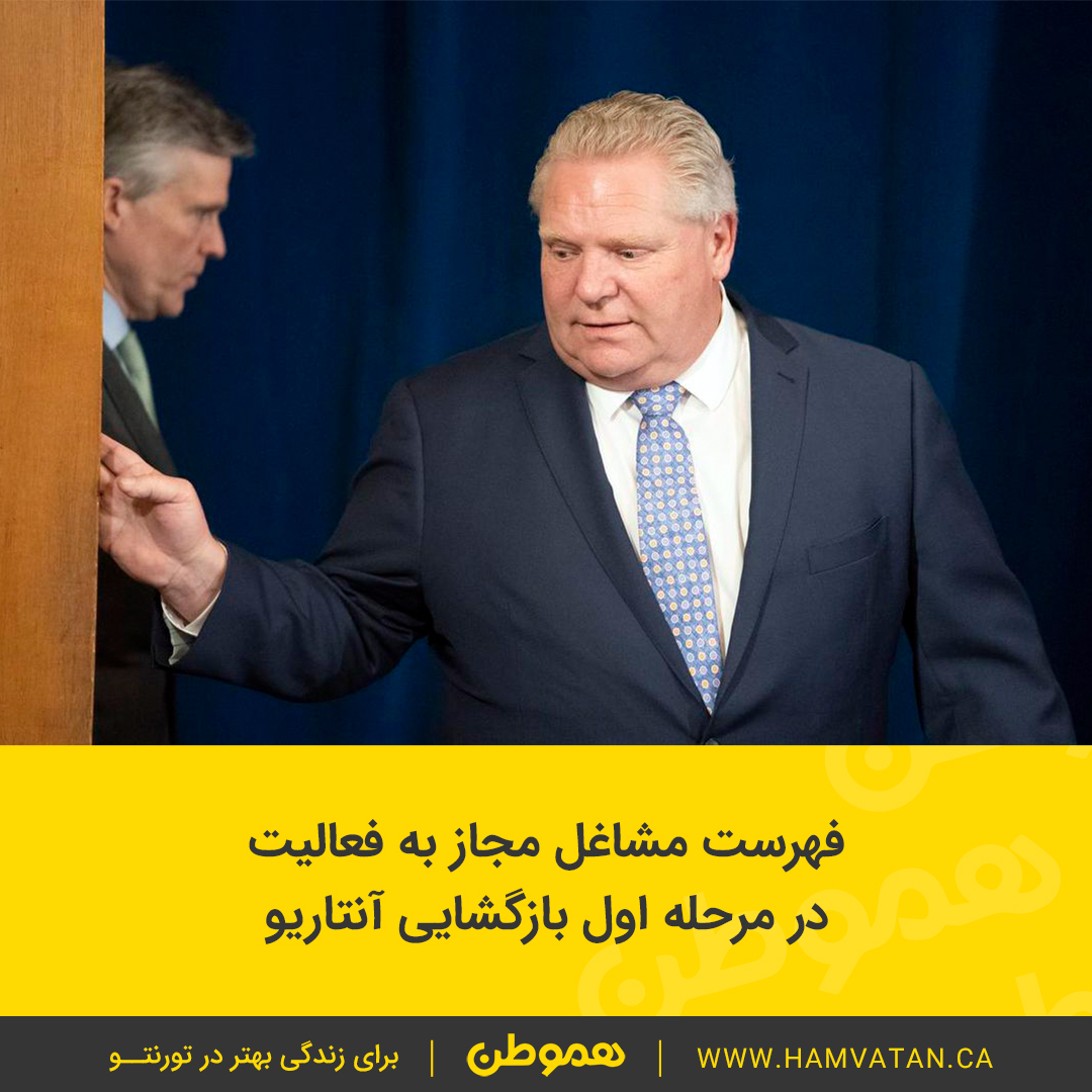 اولین مرحله بازگشایی اقتصاد آنتاریو از روز دوشنبه ۴ می ۲۰۲۰ آغاز خواهد شد.