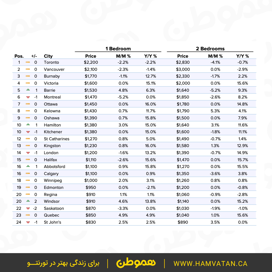 میانگین اجاره بهای واحد یک خوابه در شهر “مونترئال” نسبت به ماه قبل ۵٫۲ درصد کاهش یافته و به ۱۴۷۰ دلار رسیده که بیشترین کاهش قیمت این ماه محسوب می شود.