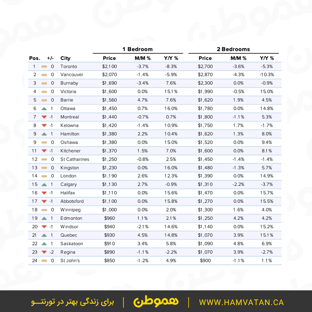 اجاره بهای واحد دو خوابه هم میانگین ۲۷۰۰ دلار است که نسبت به ماه گذشته ۳٫۶ درصد کاهش و نسبت به سال گذشته ۵٫۳ درصد کاهش یافته است.