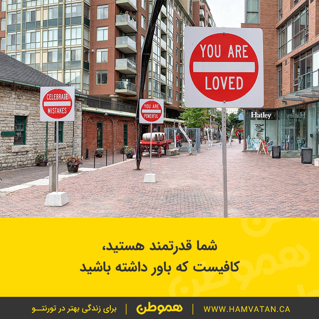 این روزها می توانید این جملات انگیزشی را در تابلوهای محله دیستلری دیستریکت تورنتو ببینید.