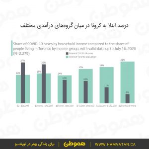 همچنین بیش از ۵۰ درصد افراد مبتلا به کرونا از خانواده های کم در آمد تورنتو بوده اند. این در حالی است که این خانواده های کم درآمد، حدود ۳۰ درصد جمعیت تورنتو را تشکیل می دهند.