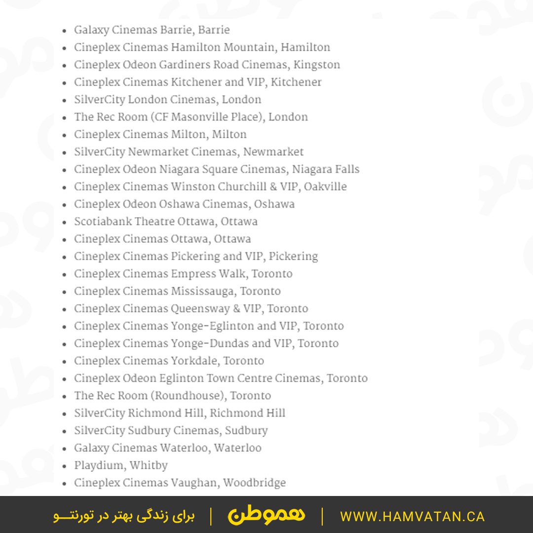 طبق اعلام Cineplex، تعداد ۲۵ سالن سینما در استان آنتاریو بازگشایی شده که برخی از آن ها در تورنتو هستند.