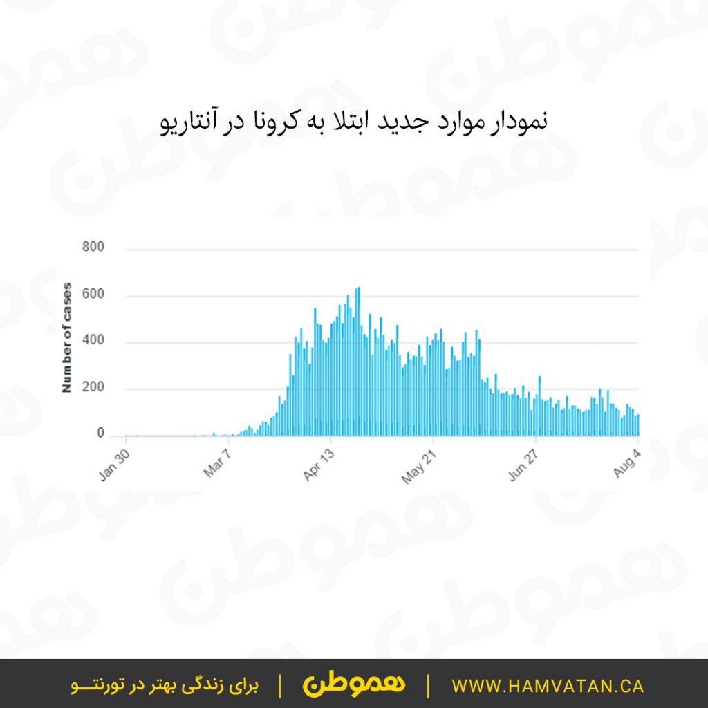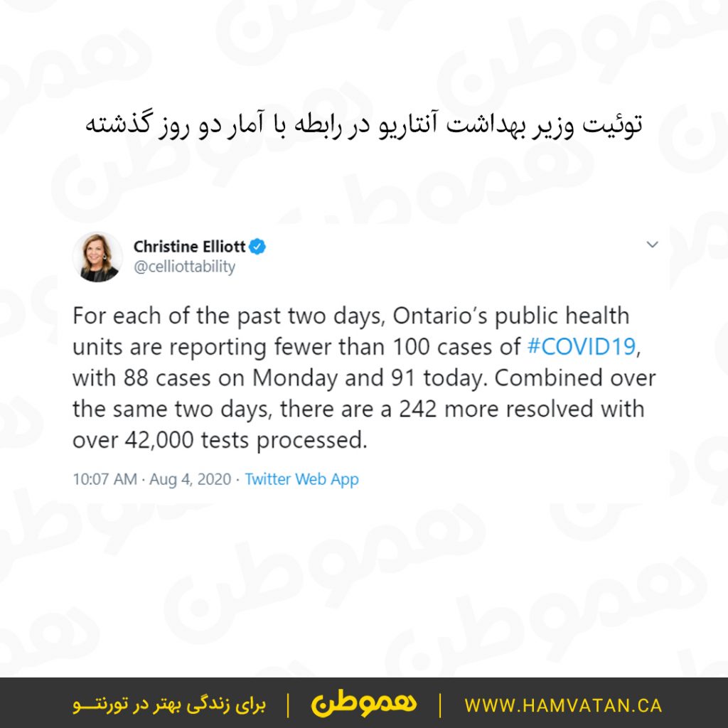 مسئولان بهداشت آنتاریو دیروز دوشنبه ۳ آگوست ۸۸ مورد جدید ابتلا ثبت کرده اند. امروز سه شنبه هم ۹۱ مورد جدید ابتلا به کرونا و ۴ فوت در آنتاریو ثبت شد.