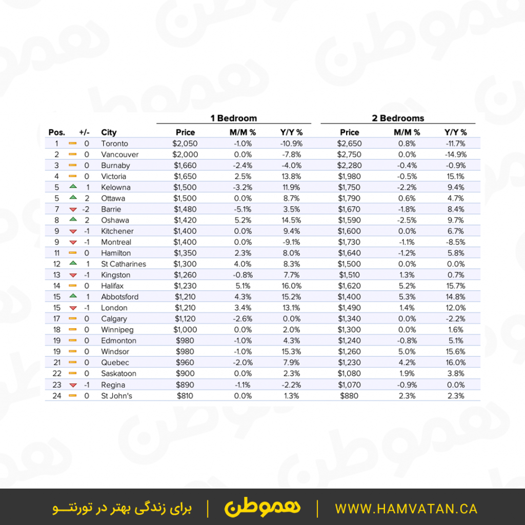 میانگین اجاره بها در شهرهای دیگر کانادا در تصویر زیر:
