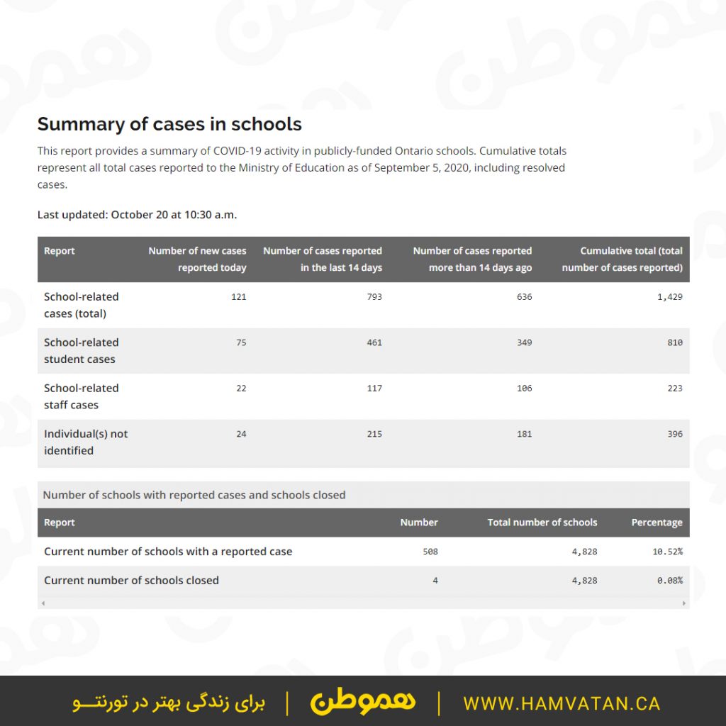 از بین ۴۸۲۸ مدرسه آنتاریو، در حال حاضر ۵۰۸ مدرسه موارد ابتلا به کرونا گزارش کرده اند و ۴ مدرسه هم تعطیل است.