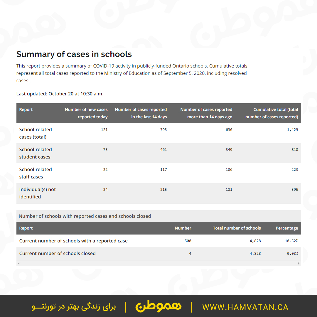 طبق گزارشی که مقامات آنتاریو امروز سه شنبه ۲۰ اکتبر منتشر کردند، در ۲۴ ساعت گذشته ۱۲۱ مورد جدید ابتلا در مدارس آنتاریو ثبت شده.