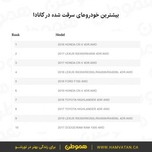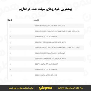 فهرست بیشترین خودروهای سرقت شده در کانادا و استان آنتاریو در تصاویر بعدی.