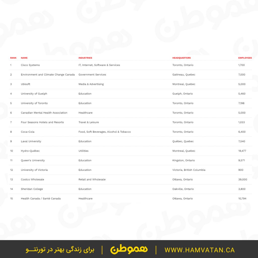 برای مشاهده فهرست ۱۵ کارفرمای برتر در کانادا، روی تصویر زیر کلیک کنید.