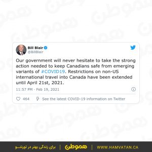 دولت کانادا محدودیت های سفر بین المللی به این کشور را حداقل تا دو ماه دیگر یعنی تا ۲۱ آپریل ۲۰۲۱ تمدید کرد.