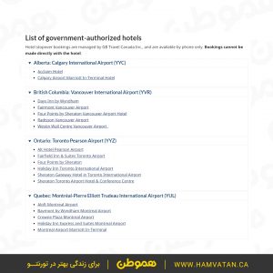 دولت کانادا روز جمعه فهرست اولیه هتل های تایید شده را منتشر کرد. ابتدا یک شماره تلفن برای رزرو هتل ها اعلام شد.