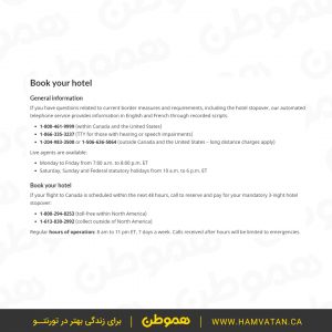 در سایت رسمی دولت کانادا آمده که برای رزرو هتل می توانید از ۸ صبح تا ۱۱ شب (هفت روز هفته) با دو شماره زیر تماس بگیرید: