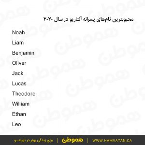 دولت آنتاریو فهرست محبوبترین نام های پسرانه و دخترانه سال ۲۰۲۰ را منتشر کرد.