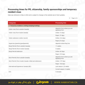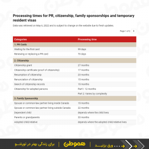 در این رابطه دولت کانادا زمان رسیدگی به پرونده های مهاجرتی مختلف را به صورت تخمینی اعلام کرده. برای مشاهده جدول تخمین مدت زمان رسیدگی به پرونده های مهاجرتی بر روی تصاویر زیر کلیک کنید.