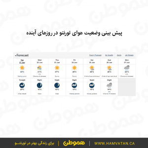 برای مشاهده پیش بینی وضعیت هوای تورنتو برای روزهای آینده بر روی تصویر زیر کلیک کنید.