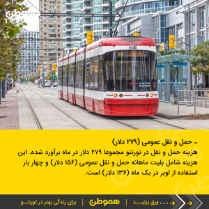 طبق این بررسی، هزینه زندگی یک فرد مجرد در تورنتو اگر از حمل و نقل عمومی استفاده کند، به طور متوسط ماهانه حدود ۳۹۴۲ دلار است (سالانه حدود ۴۷ هزار دلار).