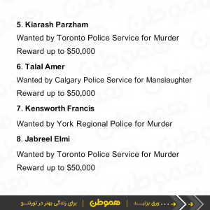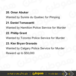 در این فهرست، نام یک ایرانی هم به چشم می خورد: کیارش پرژام. پلیس تورنتو برای اطلاعاتی که منجر به پیدا کردن کیارش پرژام شود، ۵۰ هزار دلار جایزه تعیین کرده. وی در این فهرست پنجم است.