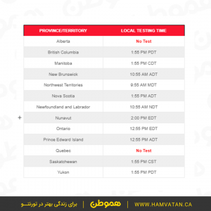 البته لازم به ذکر است که عملیات تست سیستم هشدار اضطراری، در همه استان های کانادا (به جز آلبرتا و کبک) اجرا خواهد شد. ساعت این هشدار آزمایشی را در هر استان را در ادامه ببینید.