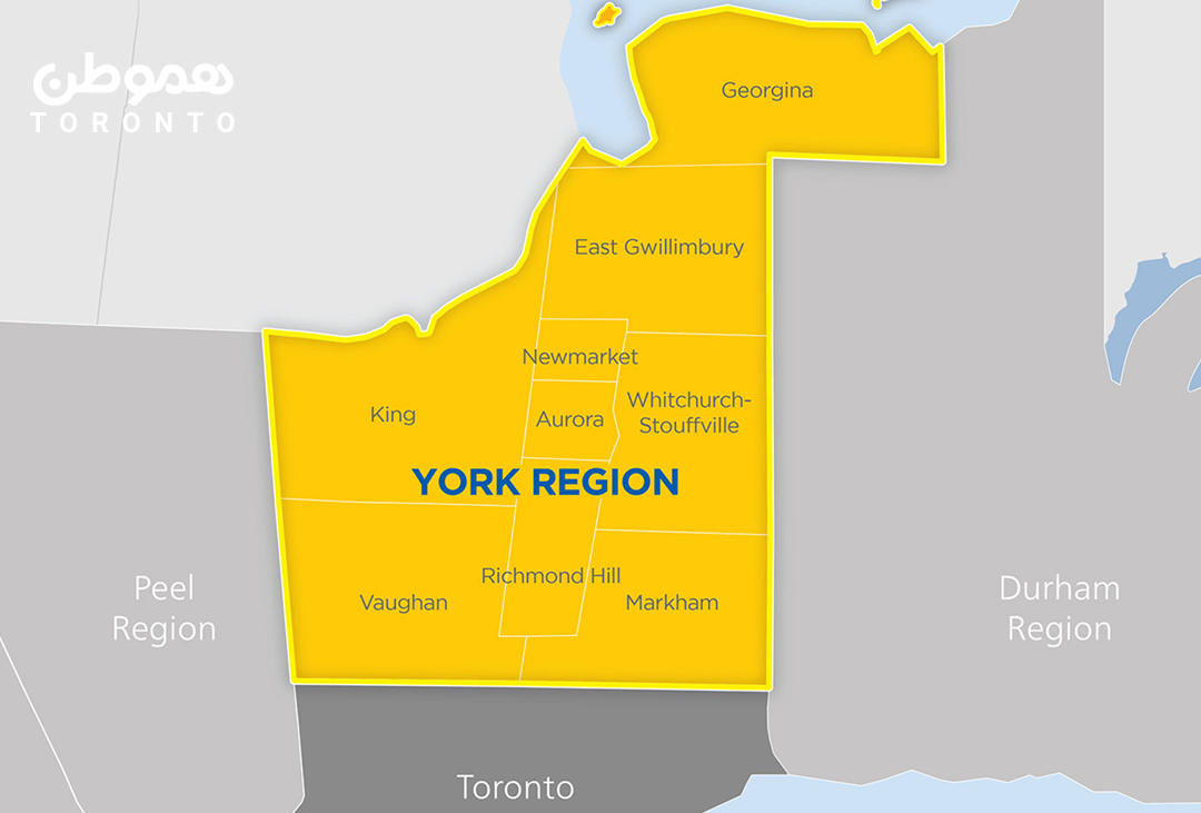 یورک ریجن از نه شهر تشکیل شده است که شامل ریچموندهیل، مارکام، آرورا، وان، نیومارکت، کینگ، جورجینا، ویتچرچ استوویل و ایست گوییلیم بری.