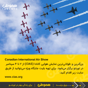 بزرگترین و طولانیترین نمایش هوایی کانادا (CIAS) از ۲ تا ۴ سپتامبر در تورنتو برگزار میشود. برای تهیه بلیت جایگاه ویژه میتوانید از طریق سایت زیر اقدام کنید: