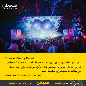 پارتیهای ساحلی «چِری بیچ» تورنتو معروف است. دوشنبه ۴ سپتامبر در این ساحل، پارتی و موسیقی زنده برگزار میشود. برای تهیه بلیت این برنامه به سایت زیر مراجعه کنید: