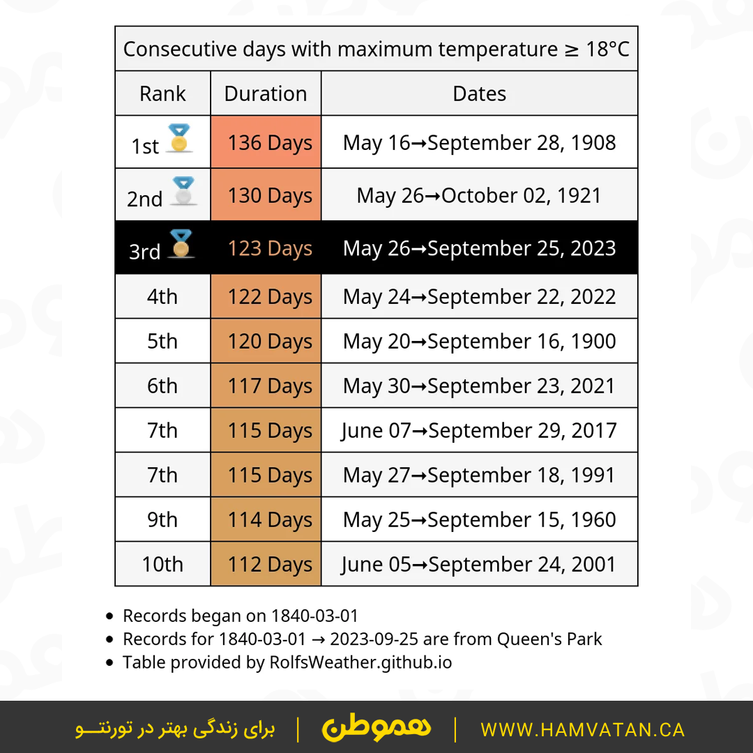 گزارشهای هواشناسی نشان میدهند که تورنتو امسال یک دوره طولانی هوای گرم را سپری کرده. دمای هوای این شهر برای ۱۲۳ روز متوالی، بالای ۱۸ درجه سانتی گراد بوده. یعنی بدون اینکه یک روز هم دما از ۱۸ درجه کمتر شود.