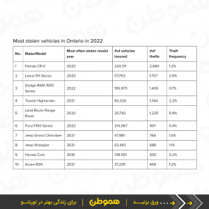 بر اساس گزارش منتشر شده، سرقت خودرو در سال ۲۰۲۲ به بالاترین حد تاریخی خود رسیده و در آنتاریو نزدیک به ۵۰ درصد افزایش یافته.