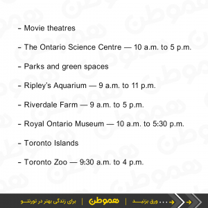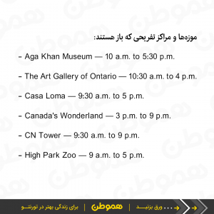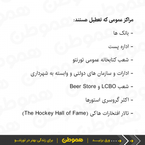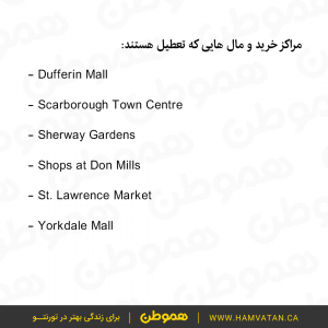 در این روز سازمانهای دولتی و بسیاری از مراکز تفریحی و فرهنگی در تورنتو تعطیل اند، اما یک سری از موزه ها، جاذبههای تفریحی و مراکز خرید در ساعات مشخصی باز هستند و در صورت نیاز میتوانید به آنها مراجعه کنید.