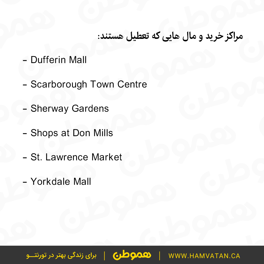 در این روز سازمانهای دولتی و بسیاری از مراکز تفریحی و فرهنگی در تورنتو تعطیل اند، اما یک سری از موزه ها، جاذبههای تفریحی و مراکز خرید در ساعات مشخصی باز هستند و در صورت نیاز میتوانید به آنها مراجعه کنید.