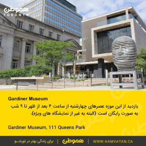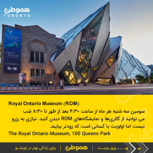 شهروندان تورنتو می توانند یک سری از روزهای خاص هفته به صورت رایگان از تعدادی از گالری ها و موزه های تورنتو بازدید کنند. اگر تازه به تورنتو آمده اید یا تا به حال فرصت نکرده اید که از موزه های تورنتو دیدن کنید، این فرصت را از دست ندهید.