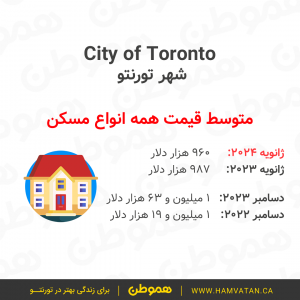 میانگین قیمت همه انواع مسکن در خود شهر تورنتو (City of Toronto) حدودا ۹۶۰ هزار دلار گزارش شده و میانگین قیمت مسکن در مناطق حومه تورنتو (Outer GTA) حدود ۱ میلیون و ۶۲ هزار دلار بوده.