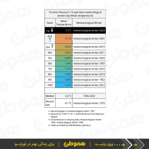 فرودگاه بینالمللی پیرسون تورنتو، گرمترین زمستان خود را از زمان شروع ثبت رکوردها در سال ۱۹۳۷ با میانگین دمای ۰٫۳ درجه سانتیگراد تجربه کرده است.