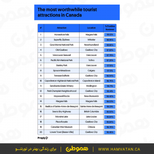 بر اساس گزارش جدید پلتفرم یادگیری زبان آنلاین Preply، یکی از آبشارهای نایاگرا فالز به عنوان بهترین جاذبه گردشگری در کانادا انتخاب شده. این گزارش با توجه به ریویوهای سایت Tripadvisor تهیه شده و به گردشگران کمک میکند تا با بهترین مکانهای دیدنی کانادا آشنا شوند.