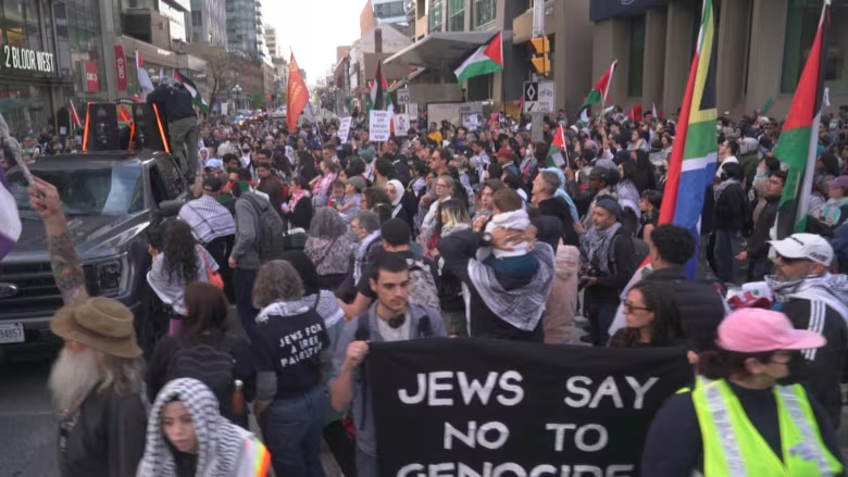 این تجمع اعتراضی از جلوی کنسولگری اسرائیل آغاز شده و به کمپ معترضان در دانشگاه تورنتو رسیده.