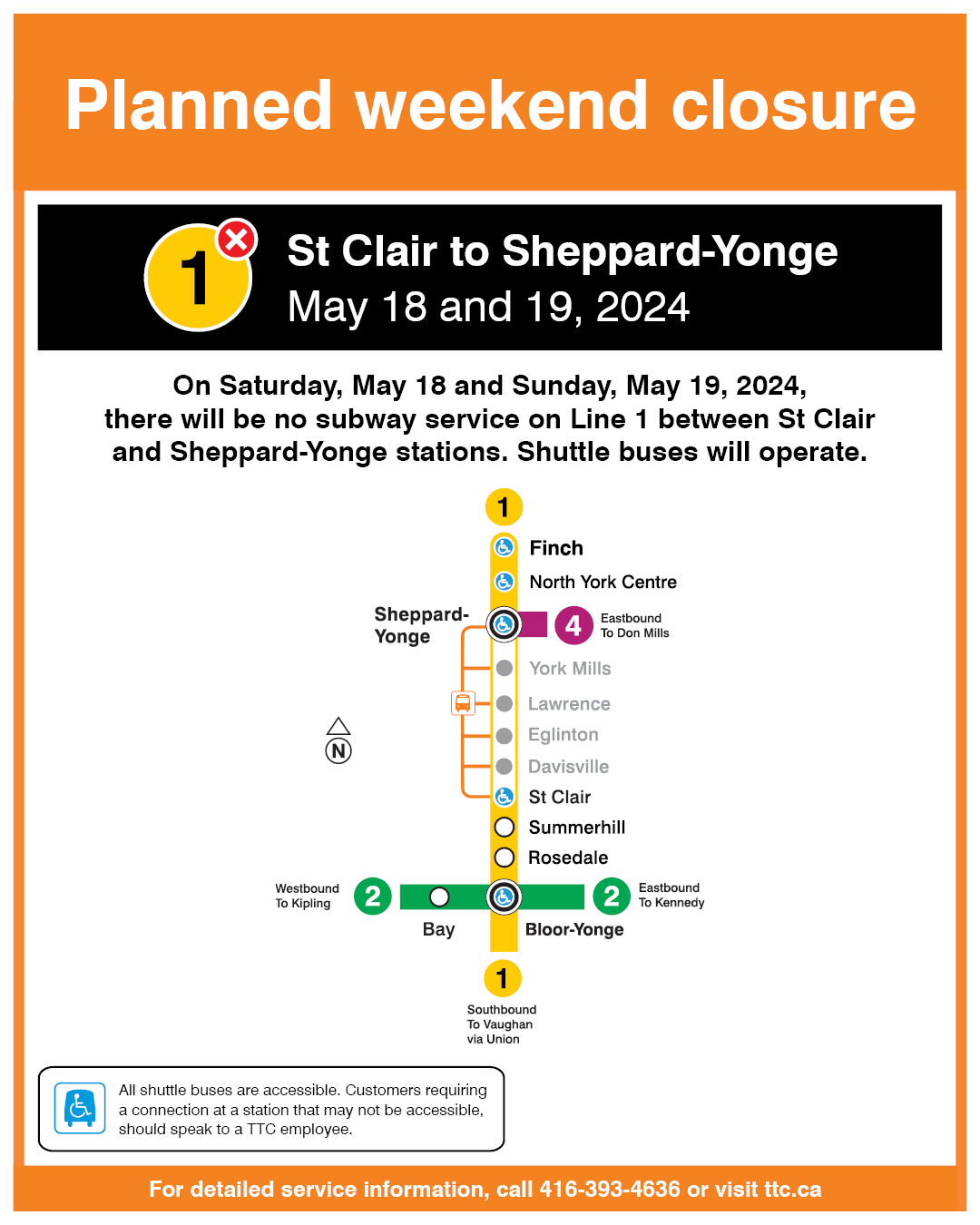 این آخر هفته (۱۸ و ۱۹ می) خط ۱ متروی تورنتو، از ایستگاه St. Clair تا Sheppard-Yonge تعطیل خواهد بود. انتظار میرود سرویس دهی از صبح روز دوشنبه ۲۰ می مجددا از سر گرفته شود.