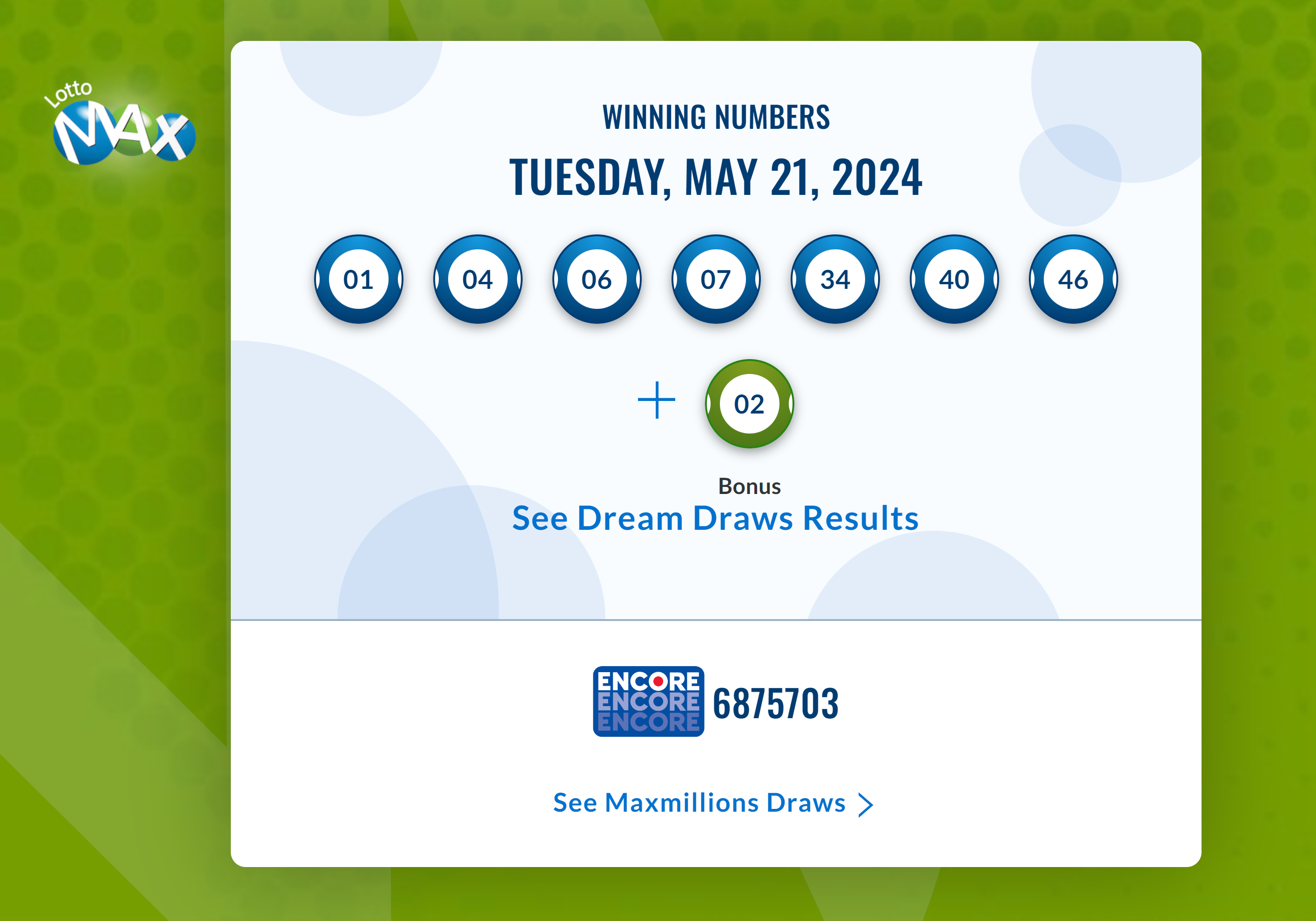 نتایج لاتاری Lotto Max کانادا (قرعه کشی سه شنبه ۲۱ می) اعلام شد. در لاتاری دیشب، هیچ کس همه اعداد درست را نداشته تا برنده جایزه ۷۰ میلیون دلاری شود. قرعه کشی بعدی، جمعه ۲۴ می انجام خواهد شد. ارقام برنده قرعه کشی دیشب به شرح زیر است: Wining numbers are 01, 04, 06, 07, 34, 40, 46 Bonus number is 02 نوشته شده در 2024-05-222024-05-23 در دسته بندی خبرهای کوتاه