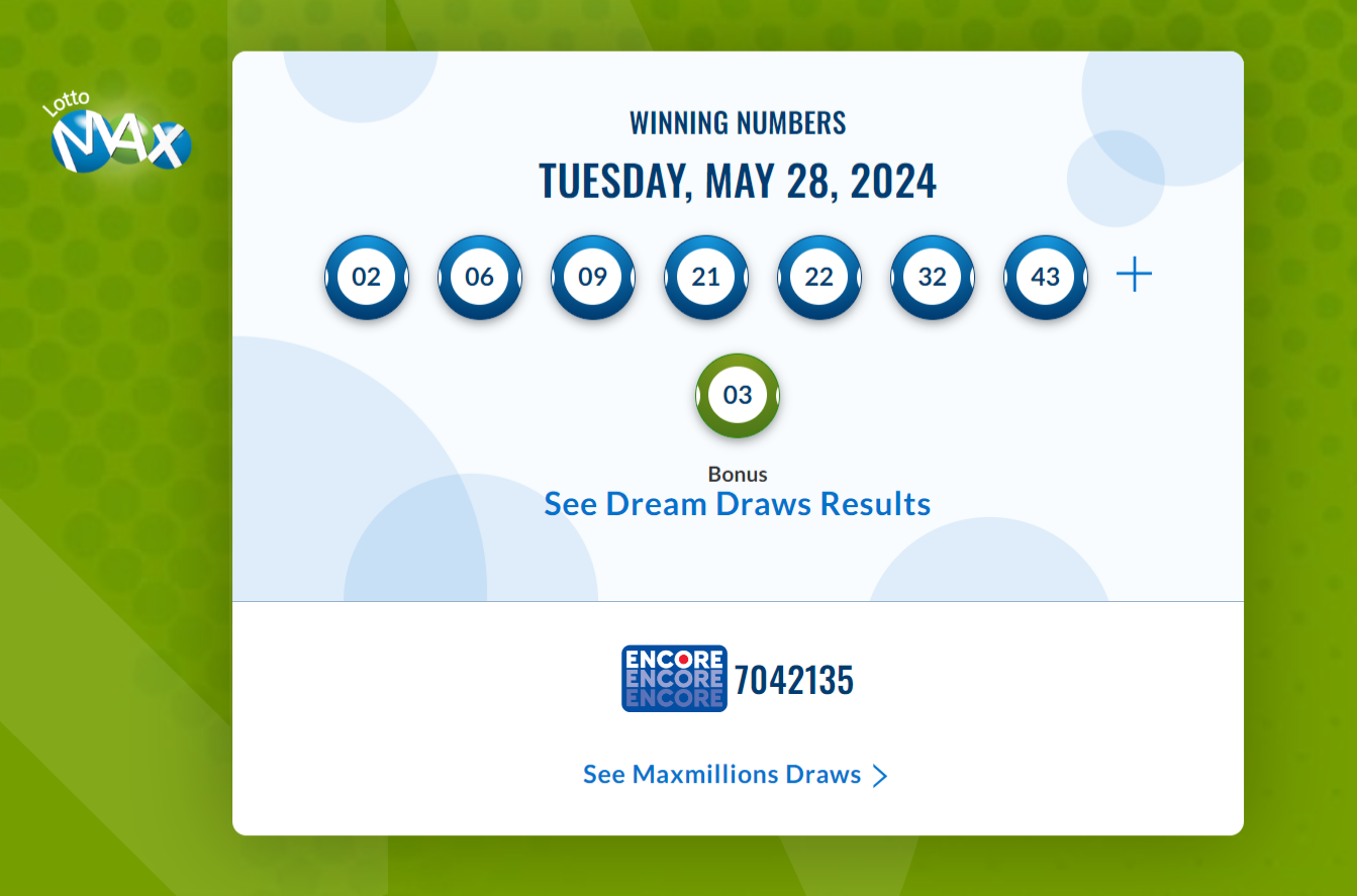 نتایج لاتاری Lotto Max کانادا (قرعه کشی سه شنبه ۲۸ می) اعلام شد. در لاتاری دیشب، هیچ کس همه اعداد درست را نداشته تا برنده جایزه ۷۰ میلیون دلاری شود. قرعه کشی بعدی، جمعه ۳۱ می انجام خواهد شد. ارقام برنده قرعه کشی دیشب به شرح زیر است: Wining numbers are 02, 06, 09, 21, 22, 32, 43 Bonus number is 03 نوشته شده در 2024-05-29 در دسته بندی خبرهای کوتاه